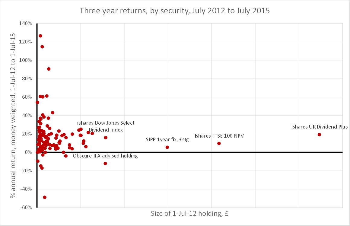 I’ve taken the investments which I had three years ago – on 1 July 2012 to be precise. I have 114 investments in this dataset, ranging from tiny individual shareholdings of under £1000 to a hefty ETF exposure into IUKD (iShares’ yield-orientated FTSE-350 ETF). By the end of the three year period, I had sold about half of these holdings. It is worth noting that my strategy and thinking has evolved significantly in the last three years; these days I would see less churn in the portfolio (and fewer small holdings).