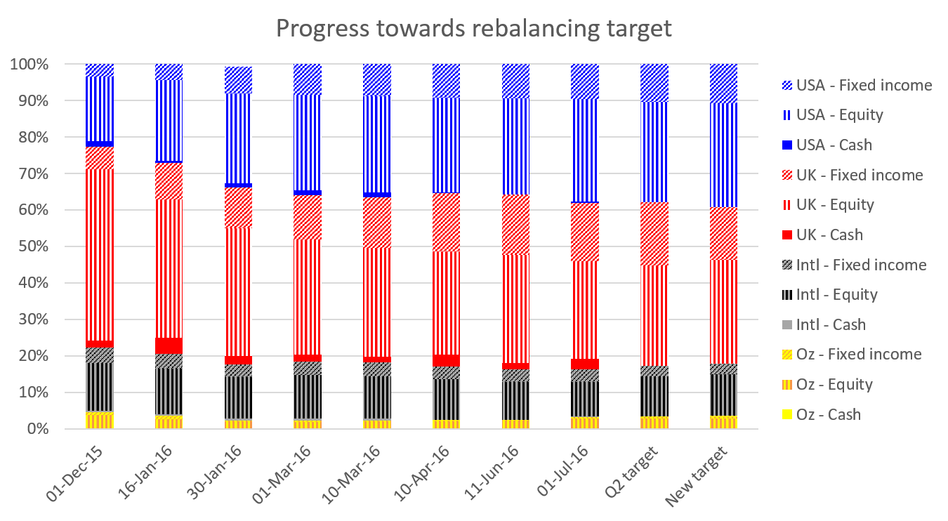 Since the end of the quarter, I have slightly changed my target allocation. With my loan now at only 30% of the value of my portfolio I’m looking to reduce my target debt level (to the level I’m already at, fortuitously). I’m also up for a slightly higher share of equities rather than bonds (i.e. I’m not up for buying more bonds at current prices!). You can see my evolution over time and the new target in the graph below. This change effectively says I want to stay where I am at the moment – and just use market dips to signal buying opportunities against this target allocation.