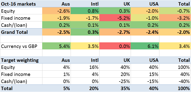 The underlying markets, measured in their local currencies, fell slightly in October. Australian equities and bonds fell around 2%. US equities fell 2%, bonds slightly less. Weighted by my exposure, the market fall was about 2.0%.