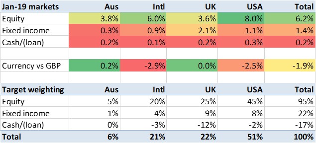Overall the markets I’m in rose over 6%. Adjusting for their falling currencies (vs the GBP), the rise was ‘only’ 4.1%’. My leverage, and my fairly strong US weighting, helped me here, as my portfolio rose 5.1% in the month. That is the 2nd best month in the 70+ that I’ve been tracking. That rise hasn’t repaired all the brutal Q4 damage, but has more than covered the net loss of the whole of last year. Many happy returns to all my readers.