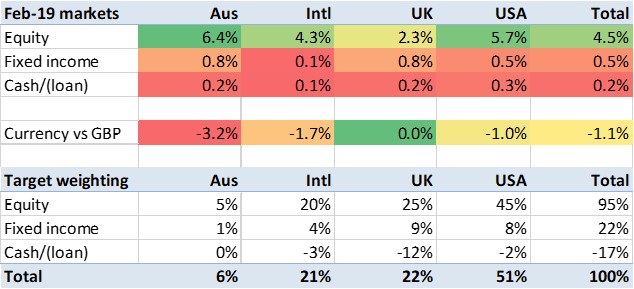 The March market movement, weighted for my target allocation, was up 2.6% (0.75% from FX, the rest from the leveraged play on equity/fixed income). My portfolio lagged this slightly, rising ‘only’ 1.9%. But for the year to date, and indeed over 12 months, I’m up 9%. That’s despite the Q4 correction setting negative records.
