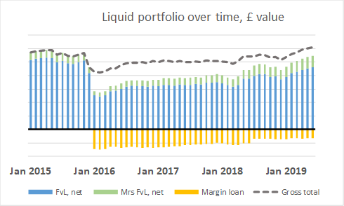 In those first few weeks after I completed I was pretty exposed. If the market had dropped 30% I would have been panicking. Fortunately, as hindsight shows, it turned out very differently; world equities are up almost 60% since then. Brexit has ‘helped’ here, because the sharp fall in the GBP after the June 2016 referendum meant my (mostly overseas) investments sharply gained versus my margin loan; this is not easy to see in the graph but it is there if you look closely.
