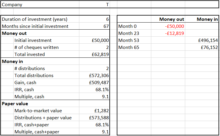 One of my best ’10x’ investments is company T, shown below. OK, so it didn’t quite make me 10x (though see below). But it exited quickly – the key money back came in month 53, with a small (15%) amount retained for a further 12 months.