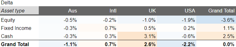 Deltas from target allocation, as at 29 February 2020