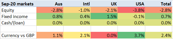 Markets moved, on a constant currency basis, down by 2.3% in September. Foreign currencies moved up, on average, almost exactly the same. This left the weighted market movement at precisely zero. Against that simple bar, my portfolio underperformed – my portfolio fell by 1%. I think this underperformance was roughly explained by my outsized tech holdings.