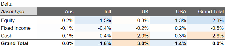 As a result of the paucity of dividend income to reinvest, I have been quiet on the trading front. I have done a modest rebalance from US Fixed Income to International Fixed Income, but otherwise held very steady. I remain slightly underweight on equities, and slightly long on cash (in fact, short on GBP debt).