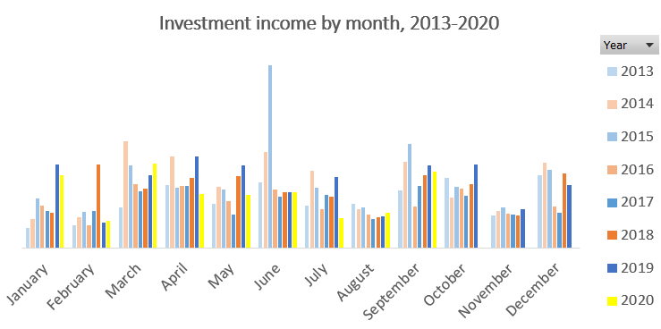 My dividend income has dropped considerably in Q3. I’ve shown my ‘@weenie graph‘ below. July was particularly miserable, with less than half the dividend income of July 2019. August, usually a very thin month, actually saw a very slight rise, year-on-year, but the normal bumper September harvest was slightly down on last year’s figure. Considering I have invested a house sized sum in the market six months ago, this is very disappointing – but it has been expected ever since the national lockdown kyboshed the economy in late March.