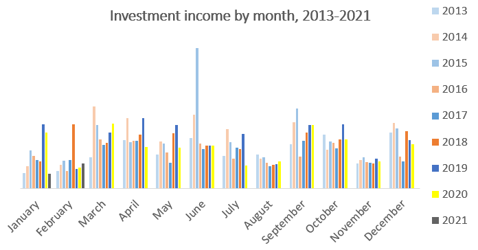 Further signs of spring are showing up in the dividend garden. February saw a small but welcome increase over the past two Februaries. As my ‘@weenie graph‘ shows below, it was the first month to show that sort of like-for-like increase since lockdown began 11 months ago.