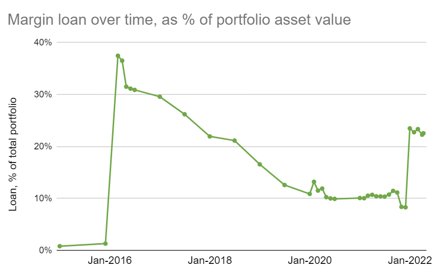 But as well as markets rising, I have also benefited from a couple of small ‘windfalls’. I have received a five figure compensation payment and a small (but five figure) venture capital distribution from a fund I have invested in. These have allowed me to make a modest repayment of my portfolio loan. All in all, my Loan-To-Value ratio has dropped slightly. At the time of writing here is the graph over time (live version shown here):