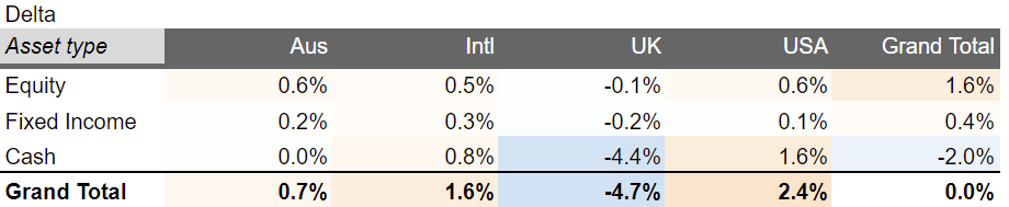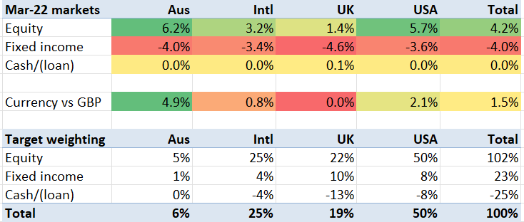 The blended average of my markets rose by 3%, in constant currency terms – due to my exposure to the increase in equities being far higher than my exposure to the drop in bond values. With the strengthening of USD and AUD, this led my markets to increase by 4.5%. Against that, my actual portfolio rose by 4.4% – roughly in line.