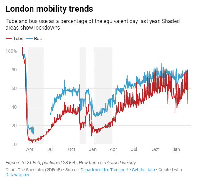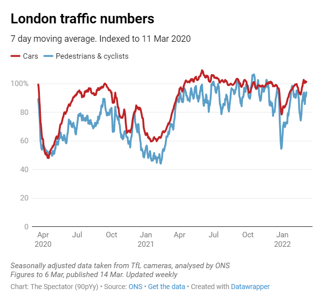 But once Easter was over, boy was London back. The school run traffic is back to not-seen-since-pandemic levels (in fact arguably above – see chart below). Restaurants are hard to book. Theatres are busy. This is all on Tuesdays-Thursdays, note, not on Mondays (which are the new Sundays). And lurgy-ridden public transport is still emptier than pre-covid. The tube is used by workers, but cars are used by school mums. But all in all, a pleasant change is in the air.