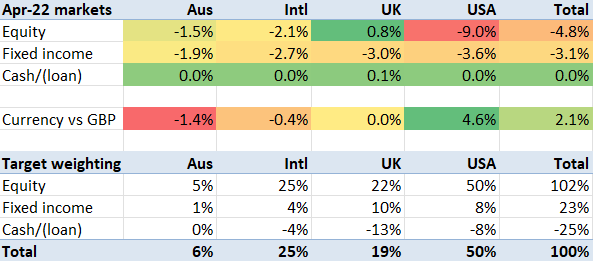 My portfolio fell about 6% in April. This was somewhat worse than the markets I’m exposed to, measured in GBP. I blame AMZN.