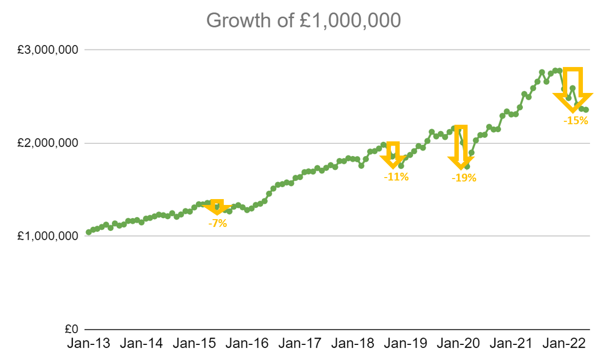 One key measure of a portfolio’s performance over time that doesn’t get enough airtime is the drawdowns it suffers. The maximum drawdown over a period is the highest percentage fall the portfolio experiences. Mine is shown on my real-time portfolio returns page. My highest, to date, is 19% (see graph below). But with two 7% falls already under my belt this year, another 7% fall would have seen me reaching a new worst ever drawdown. Thankfully, once the S&P was down 6%, it started to climb. My ‘max drawdown’ statistic is measured monthly, and my portfolio ended the month down ‘only’ 2% – which didn’t breach my maximum. But from where May finished, a 5% monthly fall would push me into worst drawdown ever territory.