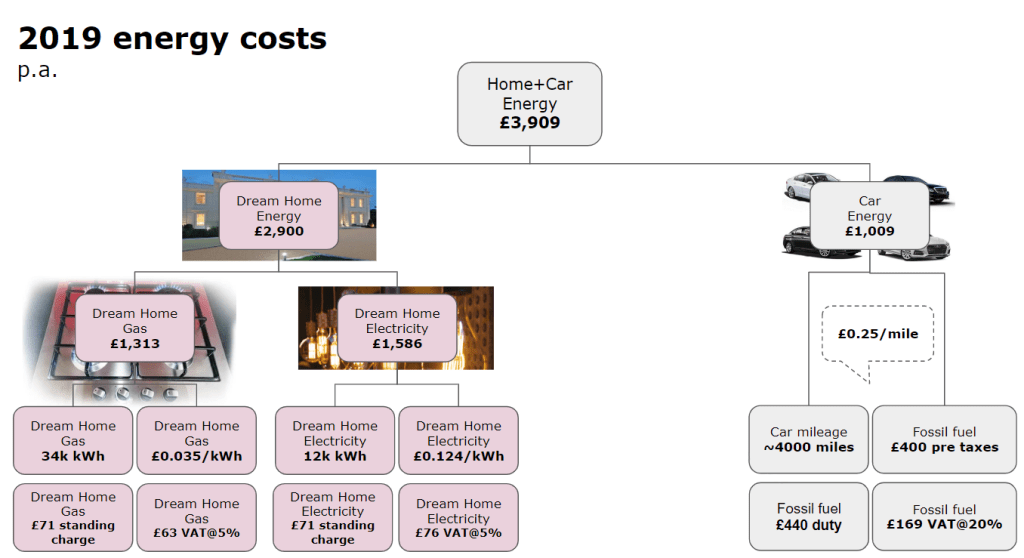 The chart below shows what this felt like chez FirevLondon back in 2019. Those halcyon days when I worked away from home five days each week, drove a petrol car, and lived in one house – admittedly my Dream Home. The Dream Home consumed around 46k kWh of energy each year – admittedly far more than an average (smaller) UK household – yet cost me less than £250pcm of energy. My car usage was far less than an average household, so the fuel for that cost me only around £1k per year – ensuring I could drive a large-engined funmobile ‘cheaply’ (25p/mile doesn’t add up to much if you don’t drive many miles!). My total fuel costs amounted to less than £4k per year. Of that, the taxman received around £840 p.a. of tax and fuel duties – chiefly from my petrol car. Energy is taxed at a reduced rate of Value Added Tax (VAT) of 5%, compared to 20% for normal expenditure.