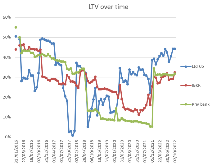 My leverage is back to record levels. This is frustrating but there is a key reason for it – I found myself withdrawing over £50k during the month from my portfolios for angel/venture capital commitments, among other things. So my margin loan increased slightly in size during the month – despite my best efforts.