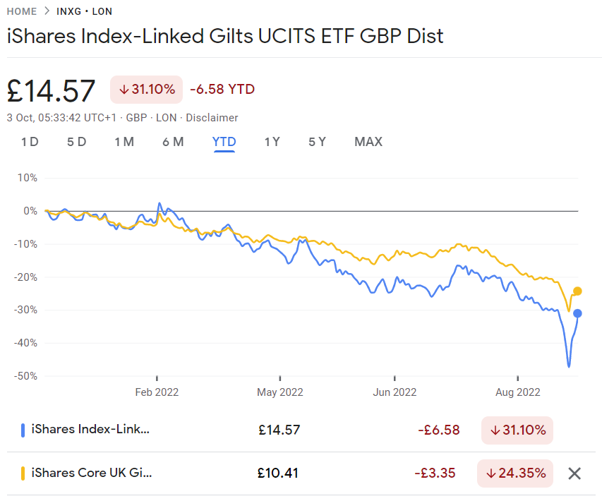 Monevator captured the chaos well with a tweet (that I am saving for the grandkids here) showing how the UK’s index-linked bonds have fallen by 50%.