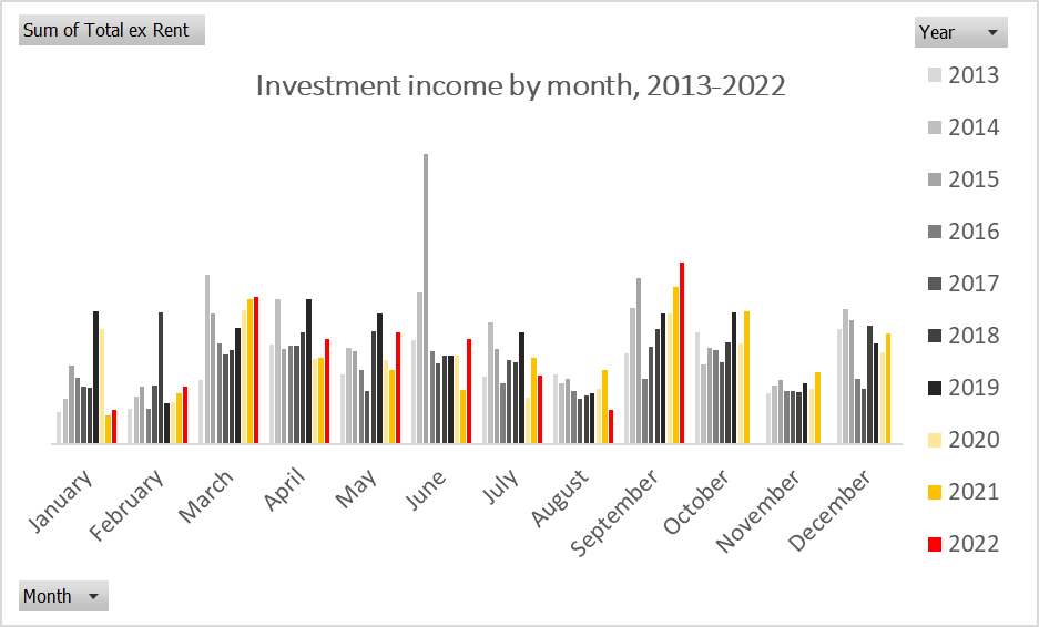 In better news, I have just had the second biggest income month in my history. This comes off a poor July and August, so I can’t draw too many conclusions. If it wasn’t for the withdrawals I had to make in September this income would have helped me reduce the size of my margin loan. In fact I ended the month with over £10k of spare cash in unsheltered investment portfolios – this will all go towards reducing reducing my debt over the next couple of weeks.