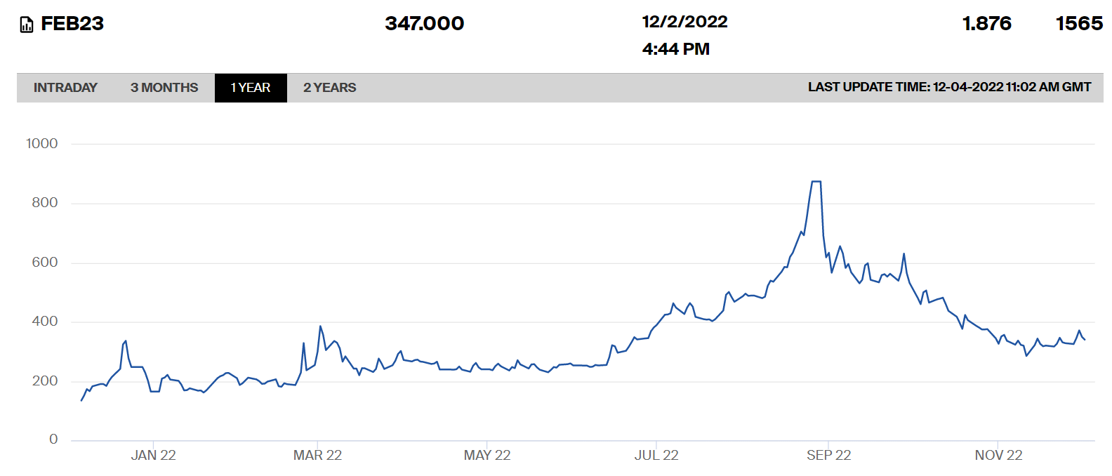 - Gas prices have more than halved from the summer peak. The graph below shows the price on 2 Dec for taking gas in Feb ’23 – this price remains about 60% higher than it was in January but it is less than half of the late August peak.