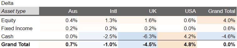 One KPI I track is the £ imbalance from my target allocation, which is over £100k smaller than it was a few weeks ago. This imbalance is still too far from £0 for my liking but I feel I’m in enough control for now. My delta from target allocation at the end of November is shown below. I am a little bit underweight USA Equities (normally my biggest exposure by a factor of 2).