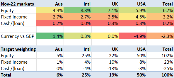 My IB subportfolios’ results are emailed to me at the start of each month. Some of these emails were tantalising. My passive ETF portfolio rose 9%, my Ltd company portfolio rose 10%. However, most of these results are in USD, and once you allow for the USD drop in November, my returns were 3-5% across the board. My overall return on the month was 3.8%, versus a weighted market average (in GBP) of 5.2%. Not the first time, I am lagging the market this year. Hopefully my readers have fared a little better.