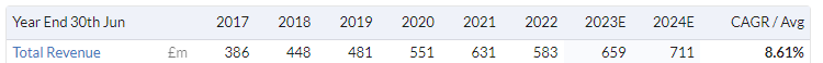 The other potentially ‘cheap’ stock now is Hargreaves Lansdown. However, caution is required. Strictly speaking, the 2023 CAGR from 2021 is only 2%. However, 2021 looks like a blip (see table below). And the brokers’ projections (those things which are usually too optimistic, remember?) suggest 2024 is going to see £711m revenues. Even based on 2021’s £631m, £711m isn’t too shabby, but up from 2022’s £583m that is a 2 year CAGR of 10.4%. If you believe the brokers, then Hargreaves Lansdown is Cheap. If you don’t, then it might not be.