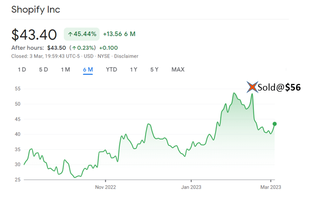 Shopify share price over last 6 months, showing my ‘impossible’ Limit $56 sell