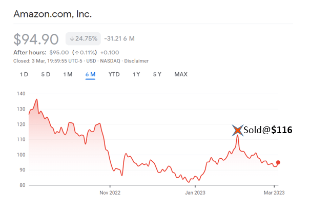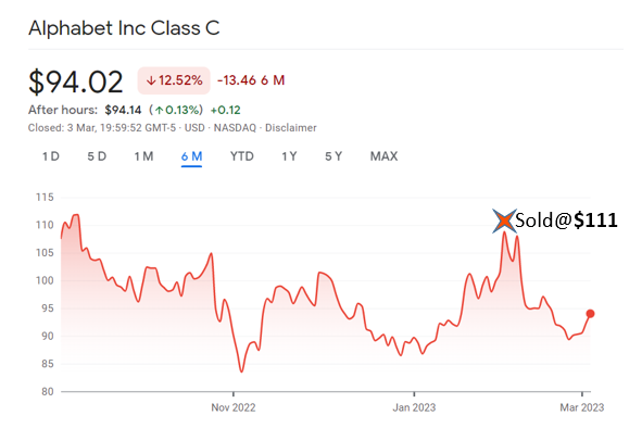 Google share price over last 6 months, showing my ‘impossible’ Limit $111 sell