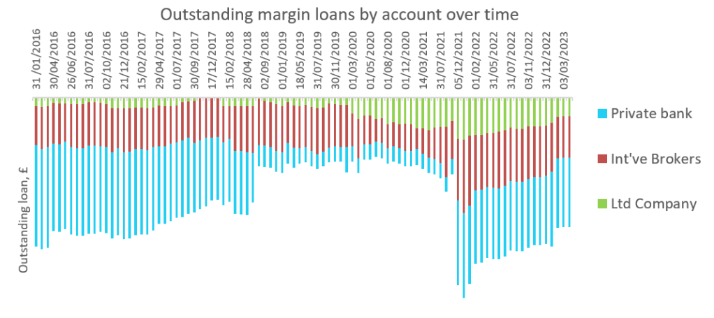 You can see in the graph below the step change in my outstanding loans in late Feb – where a chunk got paid off my margin loan. That brought me almost bang in line with my target allocation at the moment (leverage of 25% of my net portfolio value) – having been significantly underweight cash for over 12 months.