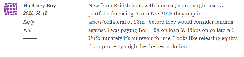 With all this noise about margin loans, I have taken the trouble to speak to a rival private bank – one with Middle East owners – who offers significantly cheaper margin loans (under 150bps above base). Sadly, when we dig in, the only way I could move would require liquidating some substantial positions with unrealised and unsheltered capital gains, so for now I am going to sit tight.