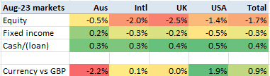 The markets were fairly miserable in August. I don’t recall any specific news events or drivers but equities dropped everywhere, and fixed income lost a bit of ground too. The USD continued to regain ground from its mid July low. The AUD fell, at one point dropping to £1:$1.9962.