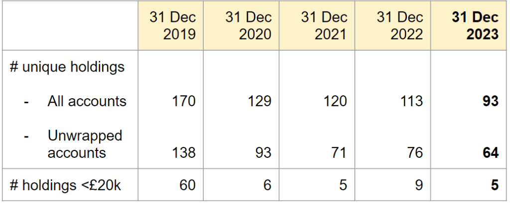 The next question, and one I have been taking increasingly seriously since 2020, is how complex is my portfolio. I took significant steps in 2020 to simplify the portfolio. And I doubled down again in early 2023. This has left me with fewer than 100 unique holdings, and only five ‘small’ holdings. I do still have 64 unique holdings in unwrapped accounts, despite aiming since 2021 for max 50. My direction of travel here is actually now in the wrong direction – especially since I have started buying individual gilts directly (though nowhere near enough to create a full ladder).