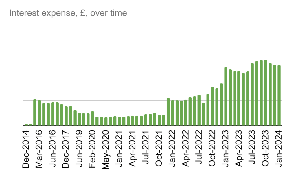 Which brings me to my debt, and the other two key metrics that I track. I will tackle the overall leverage level in a moment, but let’s start with the interest expense. With base rates having risen to 5%+ in both the UK and the USA, my interest expenses reached unprecedented levels in 2023. My annual interest bill is now a six figure sum. Nonetheless, by making some loan repayments I have reduced the annual interest bill materially in the last three months – as shown in the graph below. My expectation is that rates will not rise further, allowing me to continue to pay off my debt and reduce my interest expense in both absolute and relative terms.