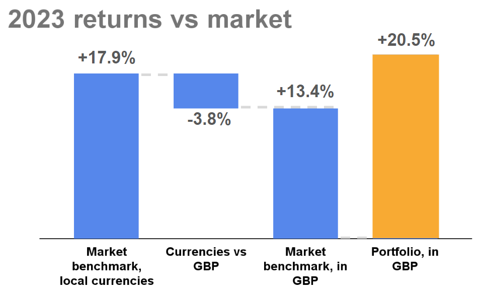 My portfolio was significantly leveraged throughout 2023. This was increasingly expensive. By the second half of the year, my cost of funds had risen to around 6%. But even with markets rising so much, in theory my leverage should have helped me. My leverage dropped from around 25% to around 20% during the year, but that should still have enabled me to outperform.