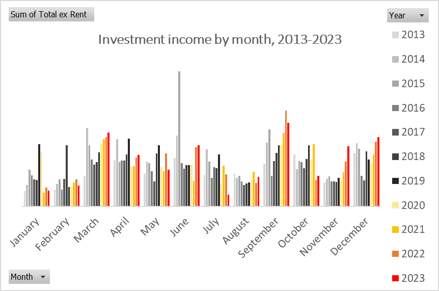 Another key metric for me is the investment income I receive. My portfolio income (i.e. dividends) varies considerably by month. I like using the ‘Weenie graph‘ to visualise it, which makes it easy to compare each month to that month in previous years. 2023 was pretty solid for dividends, but actually slightly smaller than 2022 – due to a couple of funny months July and September.