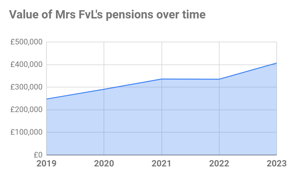 Nonetheless, there are a couple of ways in which I do not feel fully ‘ready’ financially – even if this isn’t very rational. One of those is my personal pension. Or more to the point, not my personal pension but Mrs FvL’s pension.