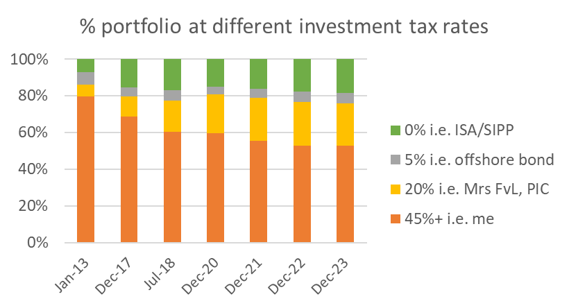 The second thing that changes my tax efficiency is withdrawals or injections from my (taxable) portfolio. The main withdrawals in the last 10+ years have been to fund house purchases. The main injections have been windfalls from my angel investing portfolio. In the last couple of years I have had very few windfalls, and plenty of withdrawals, which serves to reduce the proportion of my portfolio in taxable accounts.