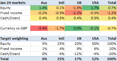 In any case, the wider markets I’m in rose by about 0.3% in January, but the currencies fell by twice that. My portfolio stayed essentially flat.