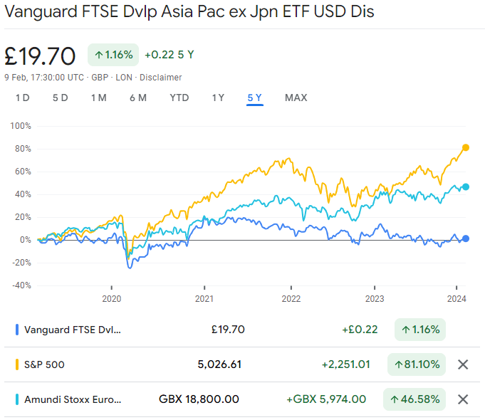 My own portfolio has been slightly overweight USA equities, which has been a good place to be. Asia lags Europe which lags the USA. While in principle I should be rebalancing into International Equities (Asia in particular), every time I do this it all gets worse (esp since late 2022 – see graph below). I know this is selling high and buying low but I am dragging my heels a bit about it!