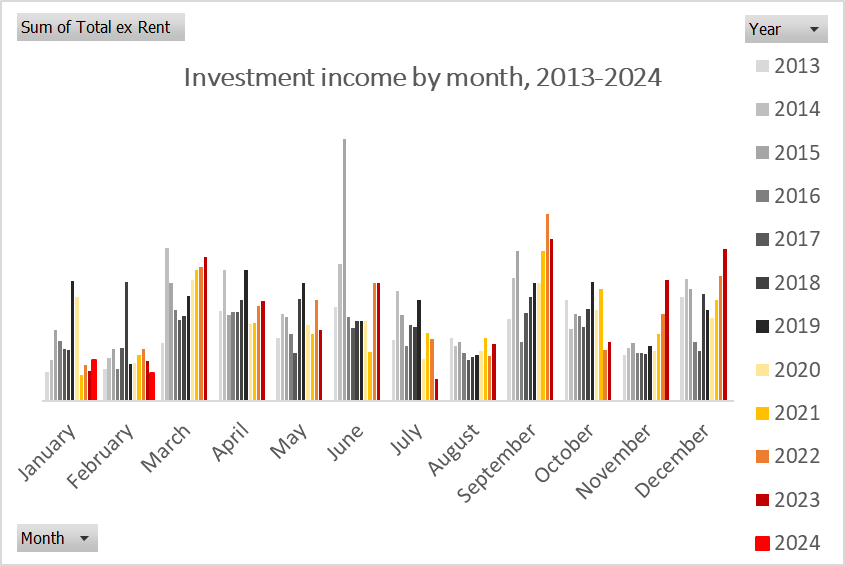 My February dividends were lower than they have been for years. February is always a very thin month for income, but unless my tracking has missed something I think I’ve had less income in February than I’ve ever recorded (since 2013 – see my ‘Weenie chart‘ below). March is usually a bumper month – the second or third highest of the year – and I remain reasonably hopeful for the 2024 edition.