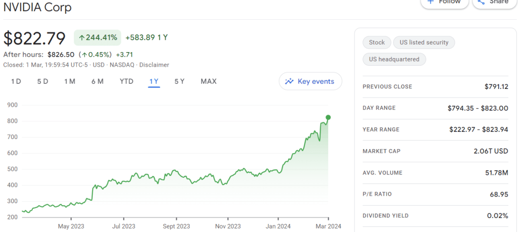 I’m also hit by my lack of a direct Nvidia position. Nvidia is talk of the S&P town at the moment – its stock rose from ~$600 to ~$800 in February alone! Nvidia is selling AI chips for $40k+ apiece, and is now worth over $2tn. This AI bubble-fuelled boom feels unsustainable to me. When the history of the next ‘correction’ happens you can be sure it will include “AI DIViNg” – Nvidia in reverse, I guess.