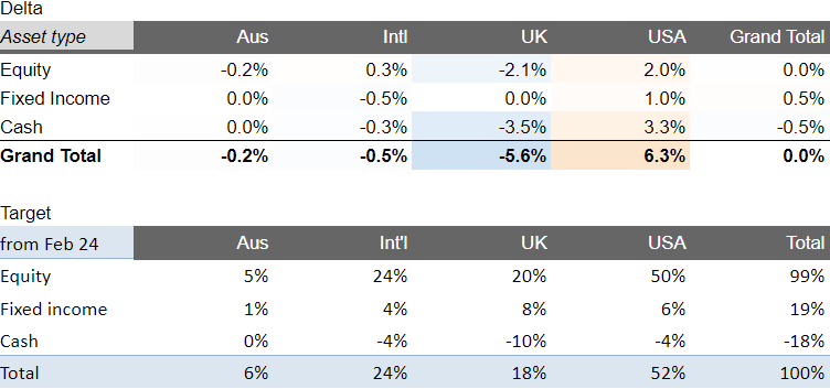 I recently tightened my target allocation – seeking to continue to reduce my leverage level steadily. My USA exposure continues to climb above my target; I am not earning enough dividends to be able to rebalance through dividend reinvestment alone and I am loath to sell long term US positions such as AMZN, GOOG and MSFT. For now, I am part of the bubble.