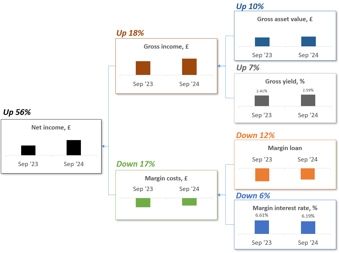 Secondly, interest rates have dropped a little over the last twelve months. Back in September ’23, by weighted average interest cost (across the three currencies I was borrowing in) was 6.61%. By the end of September ’24, it had fallen to 6.19% – a relative drop of 6%. So I have a 12% smaller debt, which is 6% cheaper. You can see where this is going – these two relatively modest changes are compounding into a 17% drop in margin costs.