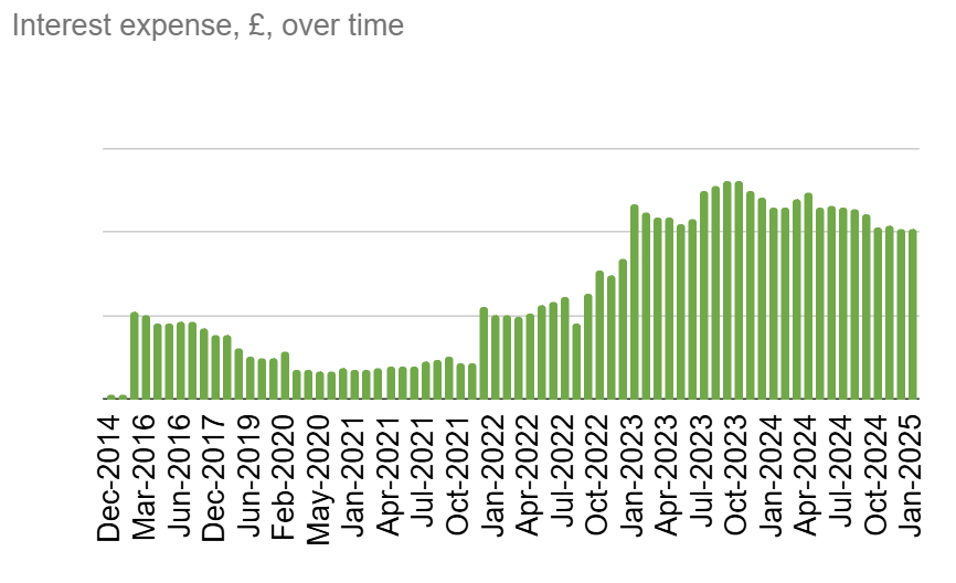 As far as interest costs go, 2024 has been a good year. Base rates fell helpfully in 2024, reducing my blended cost of funds from 6.71% to 5.94% – which has reduced my interest bill by around 10%.
