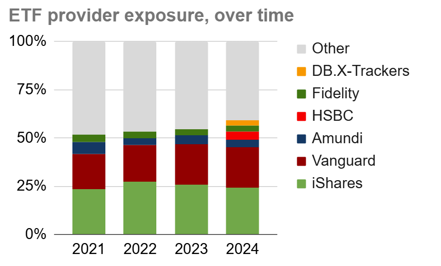 I also pay attention to diversify across ETF providers. The graph below shows my exposure to fund/ETF providers. Blackrock’s iShares remains my most common provider – they hold just over a quarter of my invested assets. Vanguard is not too far behind them. HSBC has now surpassed Amundi/Lyxor as my third biggest ETF provider, with Amundi’s policy of paying dividends only annually seeing me shift some assets away from it. None of these exposures represents a serious threat in case of failure/fraud/theft/etc, though to be clear if I lost ~25% of my invested portfolio that is a lot of money.