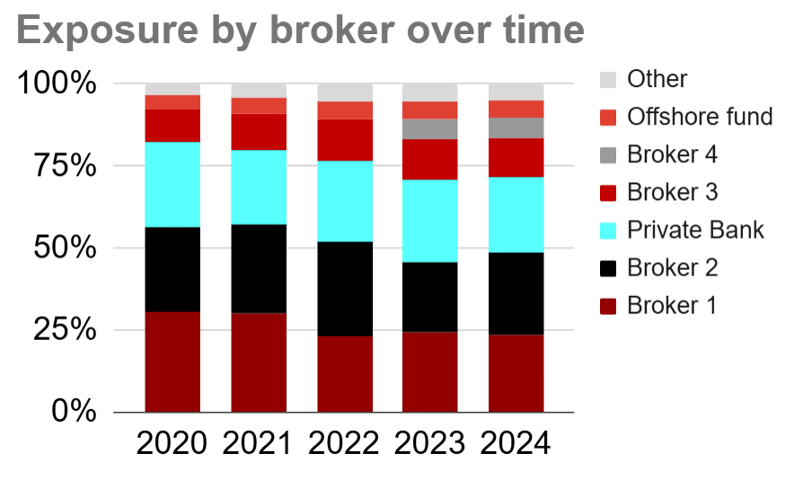I remain diversified across platform providers. My largest two accounts amount to just under half my invested portfolio (down from almost 60% three years ago – see chart below, showing % net assets by provider). Broker 2 received the bulk of the property proceeds I received this year, which makes it (by a whisker) my largest single provider.