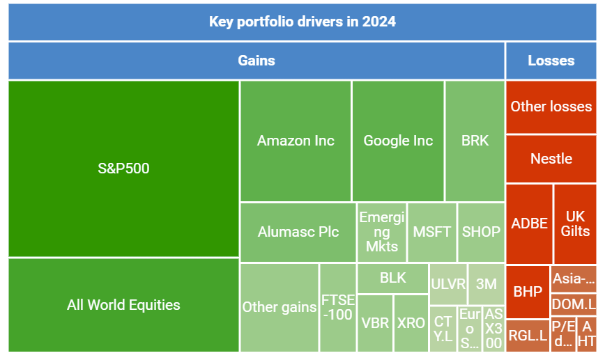 The treemap below shows the major contributors to my portfolio’s growth in 2024. It is approximate, showing the price/share movement weighted by the initial holding – it doesn’t allow for purchases/sales during the year, nor for dividends. Holdings are ETFs/index funds unless otherwise labelled. Aside from the market indexes and tech impacts mentioned above, notable performance drivers were: