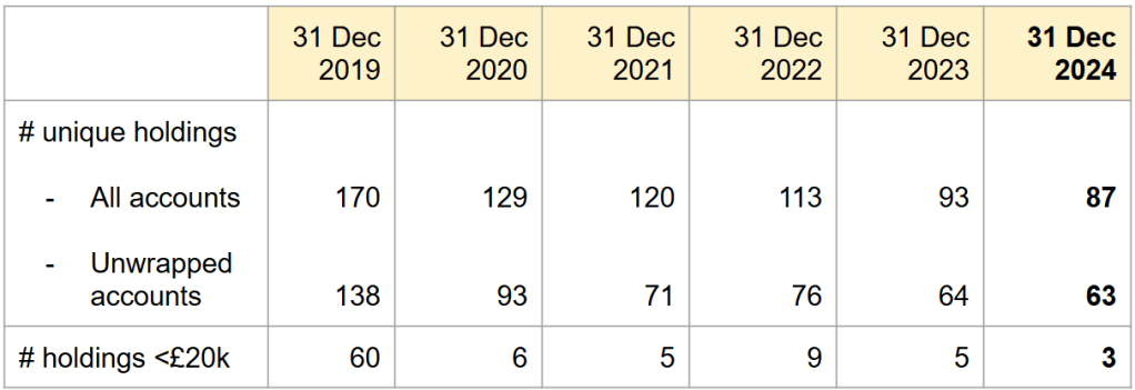 The next question in my annual process is: how complex is my portfolio? I took significant steps in 2020 to simplify the portfolio. And I doubled down again in early 2023. 2024 saw further continued streamlining, leaving me with now ‘only’ 87 unique holdings, and just a handful of ‘small’ holdings. My unwrapped accounts – where the complexity shows up in my tax reporting – do still have 63 (2023: 64) unique holdings.