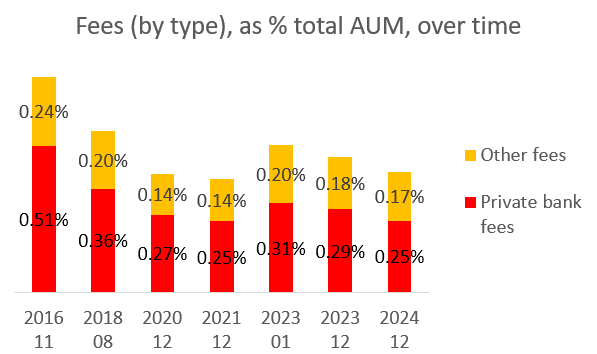 Taking all accounts and all fees into account, my total fees fell slightly in 2024 as a % of my total portfolio. My total fees were 0.43% of my total AUM. I could more than halve my total charges if I sacked my private bank, but the improvement in my overall portfolio wouldn’t be very significant. I try to forget that these fees in aggregate amount to almost 20% of my investment income – and even more of my taxable income!