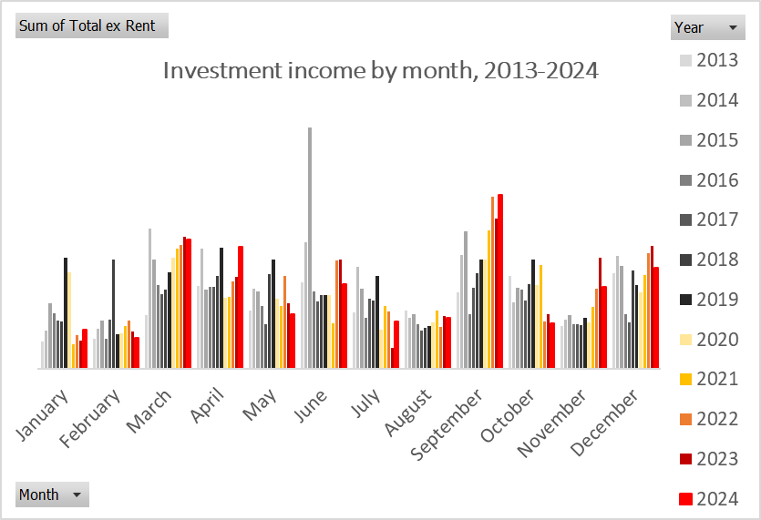 Turning to investment income, which I track across all my self-invested assets including my SIPP. I received slightly less investment income in 2024 than the previous year, which was itself down on 2022.  This is a bit surprising, because my overall portfolio has grown significantly, so the investment yield has fallen. One of the reasons is the forced retirement of some of my high yield preferred shares BWSA and RSAB which both yielded around 7%.