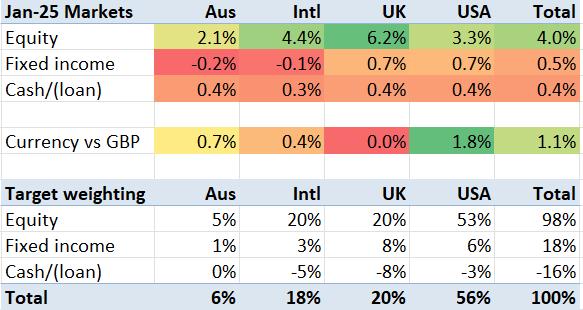 The markets seem to like Donald Trump. Trump’s inaction over his promised tariffs proved to be a tonic, adding to the cocktail of animal spirits/deregulation that Trump appears to represent. US equities rose over 3%, and the USD rose nearly 2%, so in GBP terms USD equities were up over 5%. International (i.e. non-US) equities rose too. Notably FTSE was up over 6%, the strongest month for over 2 years. Bonds were more of a mixed bag, and the GBP fell very slightly.